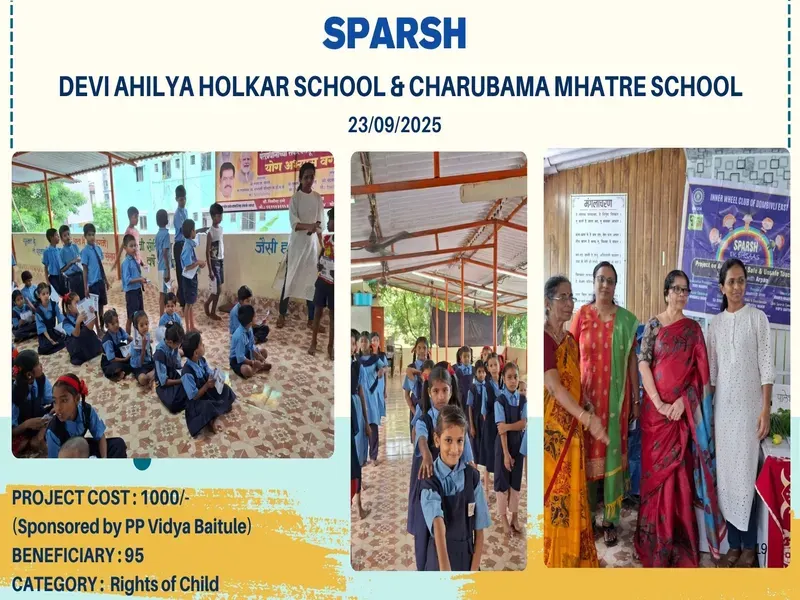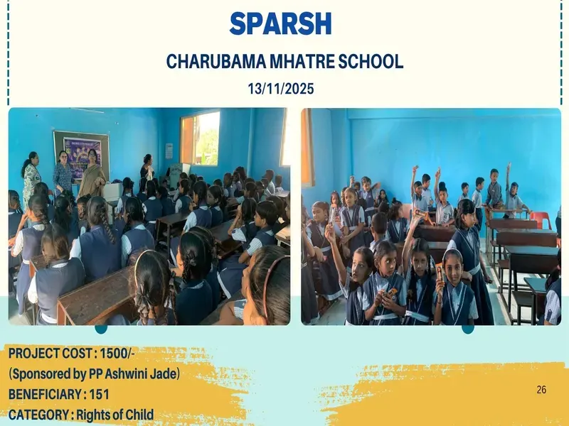 A Sparsh Awareness session was conducted at Charubama Mhatre School Dombivli West.. Students 1st &7th standard students guided about safe and unsafe touch. The session benefited 151 students and was conducted by PP Vidya Baitule & PP Nayana Sunthankar. All students were given chikki sponsored by PP Ashwini Jade.
