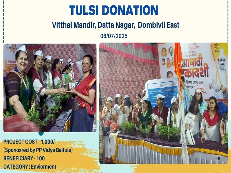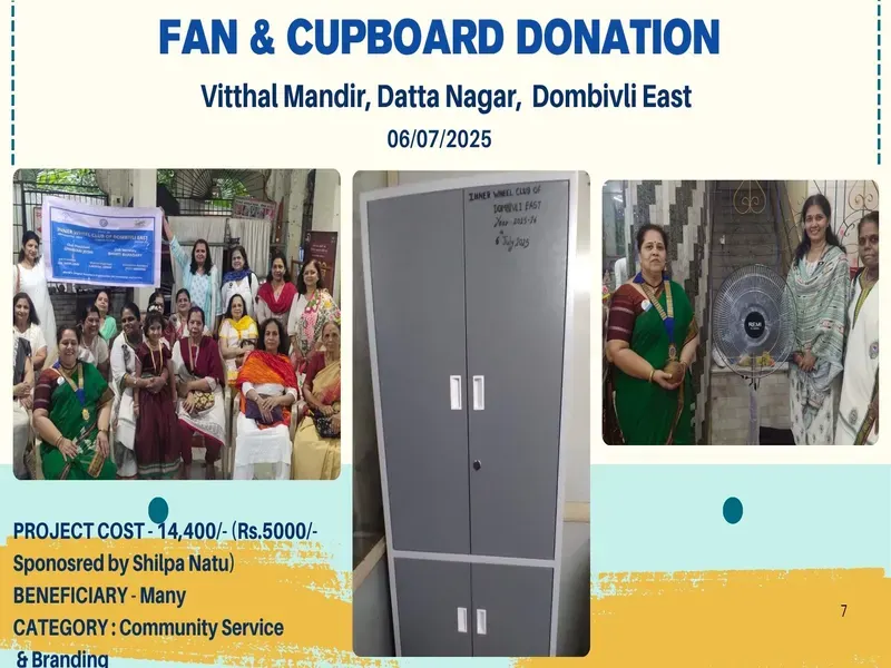 On Ashadhi Ekadashi, many devotees visit the Vitthal Mandir at Datta Nagar. To support their comfort, our club donated a fan and cupboard worth ₹5,000, contributed by member Shilpa Natu. This thoughtful gesture enhances temple facilities and reflects our commitment to community service. Together, we truly make a difference.