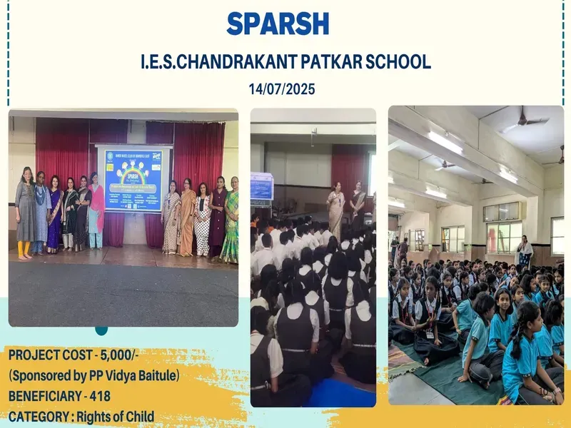 A Sparsh Awareness session was conducted at I.E.S. Chandrakant Patkar English & Marathi Medium School. Students from English Medium (8th & 9th) and Marathi Medium (5th to 8th) were guided about safe and unsafe touch. The session benefited 482students and was conducted by PP Vidya Baitule,,PP Poonam Bobade Madhuri Navre, and Leena Choudhari. All students were given chikki sponsored by PP Vidya Baitule.
