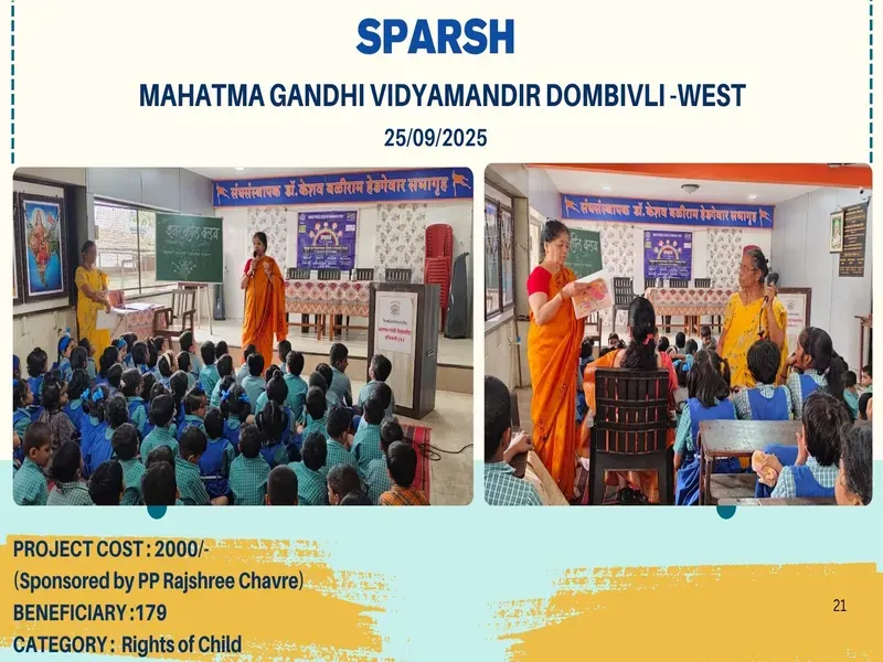 A Sparsh Awareness session was conducted at Mahatma Gandhi Vidyamandir Primary School, Dombivli West.. Students 4th to 7th standard and 8th to 10th standard students guided about safe and unsafe touch. The session benefited 95 students and was conducted by PP Vidya Baitule & PP Nayana Sunthankar. All students were given chikki sponsored by PP Rajashree Chavre