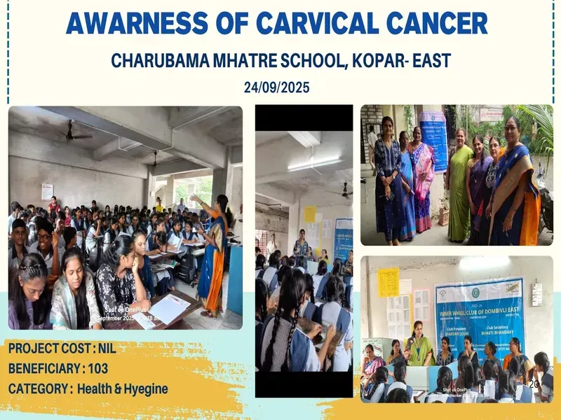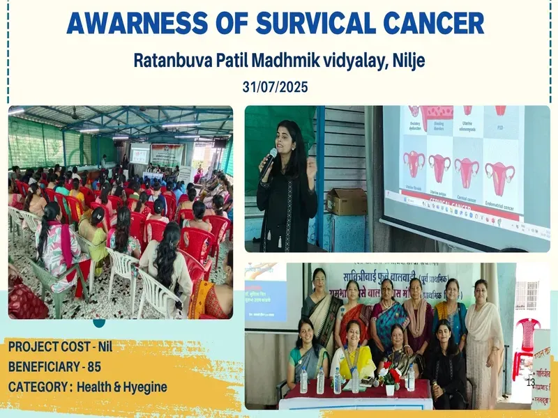 On 31st July 2025, a cervical cancer awareness session was conducted at Ratanbuwa Patil Secondary School for parents, students, and teachers. Dr. Sushila Singh shared vital information on symptoms and prevention. With 65 beneficiaries, the event saw active participation and gratitude to all supporters, especially Past President Sulabha Kamble.