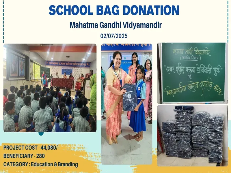 Inner Wheel club of Dombivli East proudly completed our first project of Inner Wheel year 2025–26 by donating 300 branded school bags to students of Mahatma Gandhi Vidyamandir, Dombivli West on 2nd July 2025. From tiny Jr. KG kids to Std. 1–4 students, all were happy, excited, and thankful. Their bright smiles reflected renewed motivation for learning.