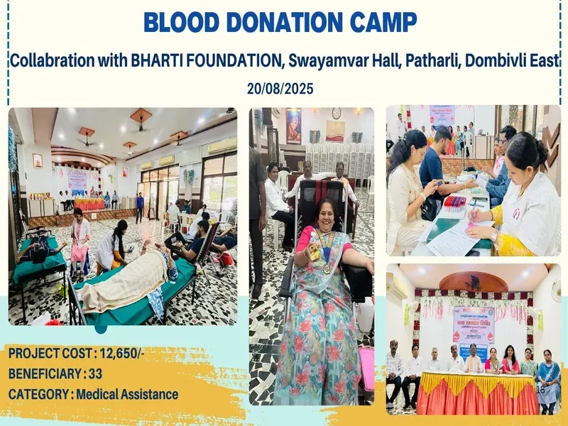 A blood donation camp for Thalassemia-affected children was successfully organized on 20th August 2025 by Bharati Foundation and Inner Wheel Club of Dombivli East at Swayamvar Hall, Patharli, Dombivli (East) from 8 a.m. to 2 p.m.The event was a great success due to the support of all dignitaries, members, and families. President Sharvari Joshi, aged 59, inspired everyone by donating blood herself. Participants also understood the struggles of Thalassemia children and their parents and experienced the true joy of saving lives. A total of 33 blood bags were collected.