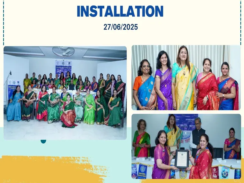 Installation Ceremony of President Sharvari Joshi & Team 2025-26 on 27th June 2025. Vice President Jayshree Pandit IPP Kirti Joshi, Secretary Bhakti Bahndary, Treasurer Leena Choudhari, ISO Sangeeta Khardikar, CC Hemangi Medhekar, PP Poonam Bobade & Executive Committee Team.