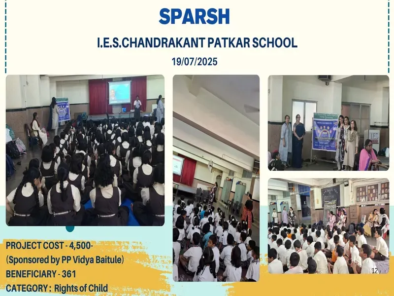 A Sparsh Awareness session was conducted at I.E.S. Chandrakant Patkar English & Marathi Medium School. Students from English Medium (5th to 7th) and Marathi Medium (1st to 4th) were guided about safe and unsafe touch. The session benefited 361 students and was conducted by PP Vidya Baitule,, Madhuri