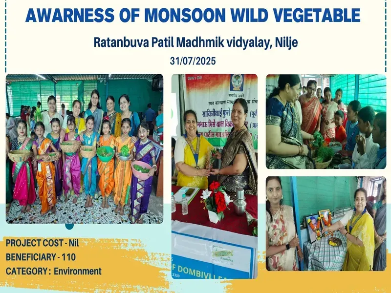 On 31st July 2025, Ratanbuwa Patil Secondary School hosted “Pavsali Ranbhajya,” celebrating traditional food culture. IWC Dombivli East was honored as the chief guest. The event showcased wild greens, their medicinal value, and nutritional benefits through dances, stories, and songs. Parents shared delicious traditional dishes. Special thanks to Past President Sulabha Kamble Madam for enabling this enriching experience.